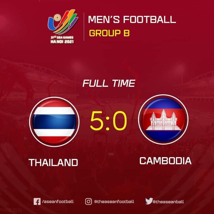 Sementara laga di Grup B lainnya, Thailand berpeluang besar ke semifinal cabang olahraga sepak bola SEA Games 2021 usai membantai Kamboja pada penyisihin Grup B. Thailand menang 5-0 di Stadion Thien Truong, Nam Dinh, Sabtu (14/5/2022). Tim berjuluk Gajah Perang Muda berpesta lewat gol Chonnapat Buaphanpada menit keempat, Korawich Tasa (31’), Worachit Kanitsribumphen (41’) dan brace Patrik Gustavsson (72’, 89’). B