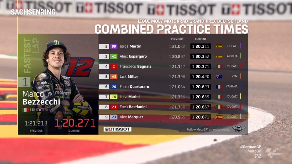 Jakarta – Marco Bezzecchi menjadi yang tercepat dalam sesi kali ini sementara Marc Marquez terlempar ke urutan ke-14. Jorge Martin dan Aleix Espargaro melengkapi tiga besar yang tercepat di Sirkuit Sachsenring, Jerman, pada Jumat (16/6/2023) malam WIB. Bezzecchi menjadi yang tercepat dengan catatan waktu 1 menit 20,271 detik.