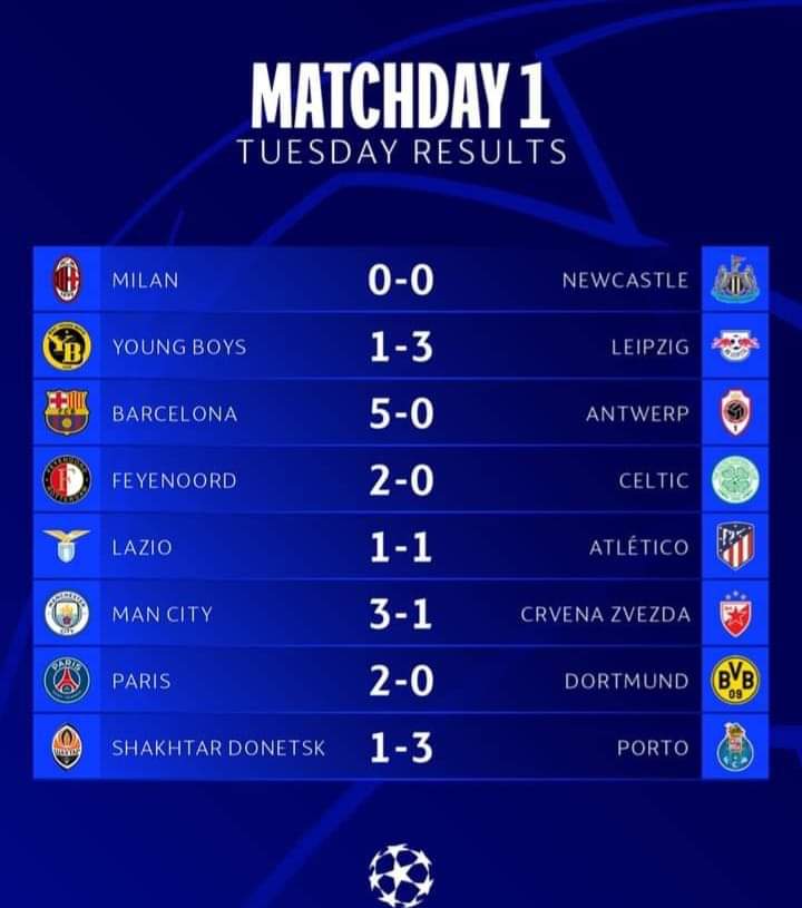 Man City sempat tertinggal lebih dulu lewat gol Osman Bukari di menit ke-45. Namun dua gol dari Julian Alvarez dan gol dari Rodri membuat Man City menang 3-1 di akhir pertandingan. Dua tim Italia, AC Milan dan Lazio sama-sama meraih hasil imbang saat tampil di kandang. Milan ditahan imbang tanpa gol melawan Newcastle United. Sedangkan Lazio bermain 1-1 melawan Atletico Madrid. Pablo Barrios membawa Atletico unggul di menit ke-29. Lazio kemudian selamat dari kekalahan karena Ivan Provedel mencetak gol di masa injury time.