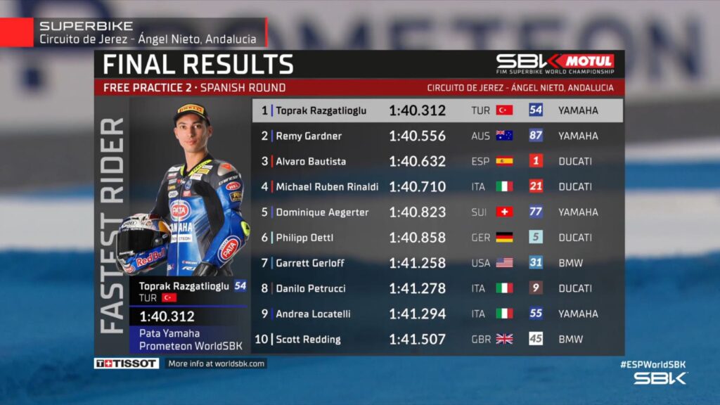 Sementara itu posisi keempat dan kelima masing-masing ditempati oleh pembalap Aruba.it Racing Ducati lainnya, Michael Ruben Rinaldi, dan pembalap GYRT GRT Yamaha WorldSBK, Dominique Aegerter. Dalam sesi ini, semua pembalap akhirnya turun lintasan. Pasalnya, pada sesi FP1, hanya empat rider yang memilih berkendara akibat cuaca yang dingin dan lembap akibat hujan yang turun sebelumnya, sementara yang lain bertahan di garasi.