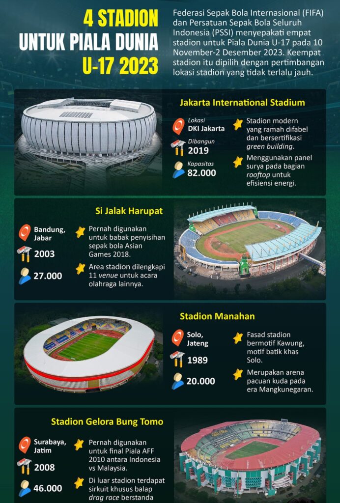 Jakarta – Piala Dunia U-17 akan segera digelar beberapa hari lagi. Sebagai tuan rumah, Indonesia telah bersiap baik dari sisi kesiapan timnas Indonesia yang akan ikut dalam gelaran Piala Dunia U-17 untuk pertama kalinya dalam sejarah, juga kesiapan dari sisi sarana dan prasarana untuk mengelar Piala Dunia U-17 dengan baik dan sesuai standard yang diterapkan FIFA. Indonesia telah menyiapkan 4 stadion untuk mengelar Piala Dunia U-17. Keempat stadion itu adalah Jakarta International Stadium, Stadion Si Jalak Harupat, Bandung, Stadion Manahan,Solo dan Stadion Bung Tomo, Surabaya.