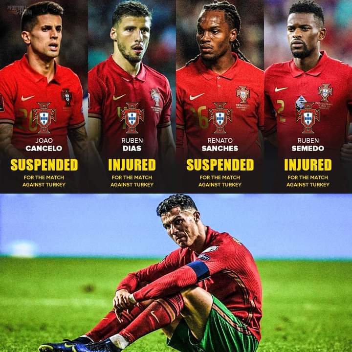 Joao Cancelo, Ruben Diaz, Renato Sanchez dan Ruben Semedo dipastikan tidak akan dapat memperkuat Portugal dalam laga penting melawan Turki akibat hukuman akumulasi kartu maupun cedera. PArahnya keempat pemain itu adalah peara pemain pilar bagi Portugal. Portugal membutuhkan semua pemain terbaiknya agar dapat memenangkan laga melawan Turki sebelum laga berat lainnya yang masih akan dihadapi setelah melewati Turki, yaitu kemungkinan berhadapan dengan juara Euro 2020, Italia.
