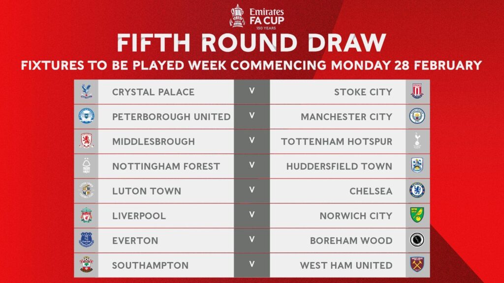 FA sudah melakukan drawing untuk laga di putaran kelima. Hasilnya kembali menempatkan tim tim besar berhadapan dengan tim lemah. Seperti Manchester City yang hanya berhadapan dengan Peterbrough United, Chelsea melawan Luton Town dan Everton bertemu dangan Boreham Wood.