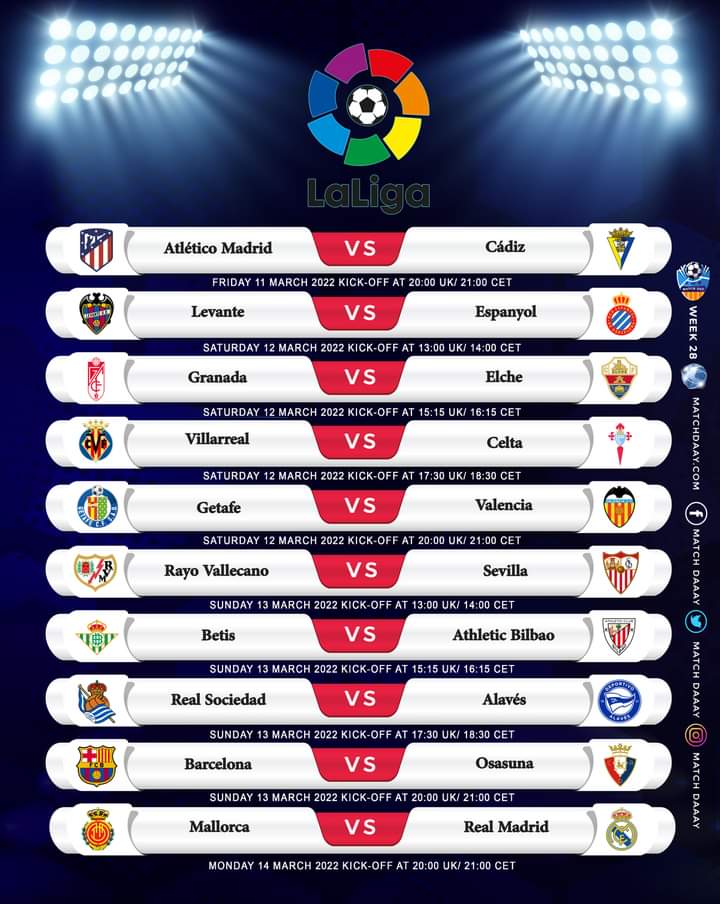 Namun Sevilla, Barcelona dan Atletico Madrid mempunyai peluang untuk memangkas jarak dai real Madrid sembari berharap Madrid akan terpeleset saat menjamu Real Mallorca pada laga yang akan digelar Selasa, 15/3/2022 mendatang. BArcelona dan Atletico yang sama sama meraih 48 poin masih berjarak 15 poin dari Real Madrid dan berjarak 7 poin dari peringkat kedua, Sevilla.