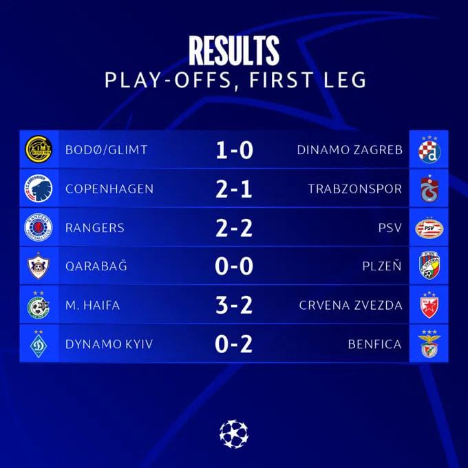 Jakarta – Babak playoff leg pertama Liga Champions untuk memperebutkan enam tiket terakhir Liga Champions musim ini telah digelar Kamis dini hari 18/8/2022. Dua tim favorit PSV Eindhoven dan Rangers FC harus puas bermain imbang 2-2. Sementara Benfica memenangkan laga melawan Dynamo Kiex dengan skor 2-0. Sedangkan Bodo/Glimt membuat kejutan dengan mengalahkan Dinamo Zagreb 1-0.
