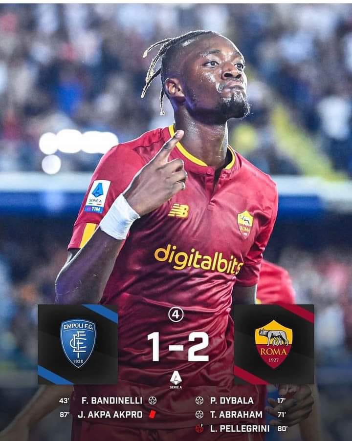 Jakarta – AS Roma segera melupakan kekalahannya di ajang Liga Europa pekan lalu dan berhasil meraih poin penih saat mengalahkan Empoli dengan skor tipis 2-1 dalam partai Serie A 2022/2023 giornata 6 yang digelar di Stadio Carlo Castellani, Selasa (13/9/2022) dini hari WIB. Dua gol kemenangan Roma masing-masing dicetak oleh Paulo Dybala dan Tammy Abraham. Sementara itu, Empoli sempat menyamakan kedudukan lewat gol Filippo Bandinelli.