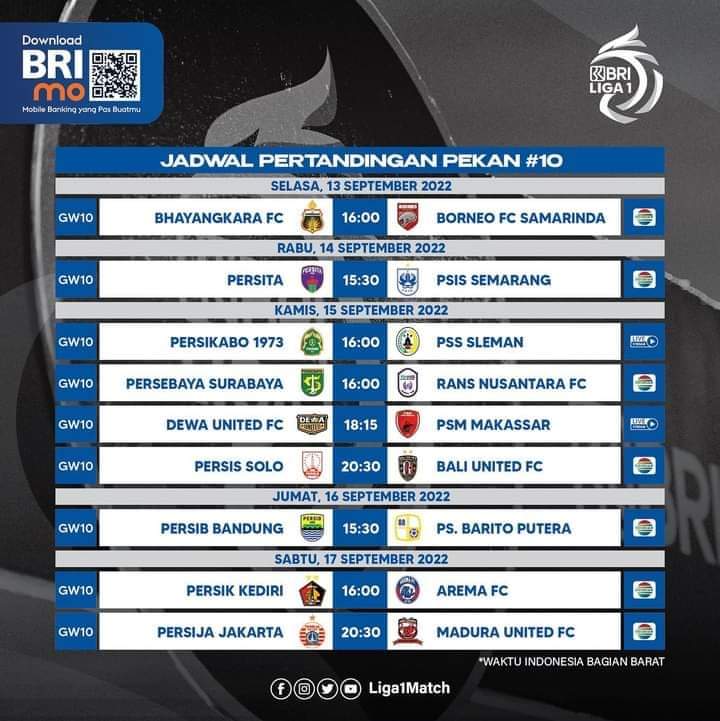 Berikut jadwal laga pekan kesepuluh Liga 1 Indonesia.
