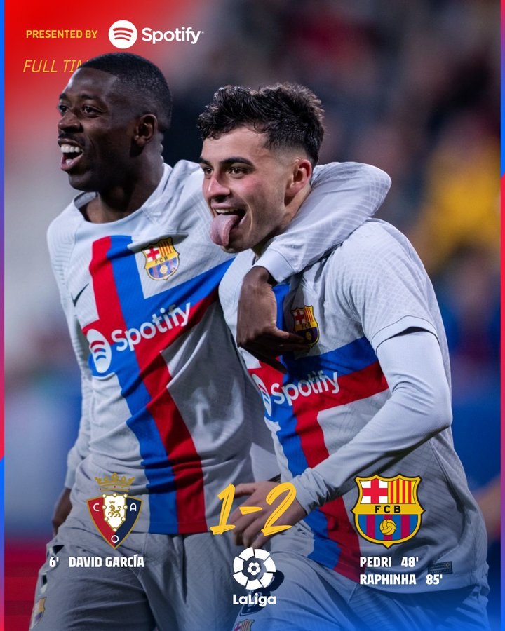 Sebaliknya, Barcelona justru bisa membalikkan keadaan di menit ke-85 lewat pergerakan yang efektif dan efisien. Frenkie De Jong mengirimkan umpan akurat saat melihat pergerakan dari Raphinha. Raphinha lalu menuntaskannya dengan sundulan karena posisi kiper Aitor sudah keluar jauh dari gawang. Skor akihir 2-1 cukup membuat Barcelona pulang dengan membawa tiga poin dari Osasuna.