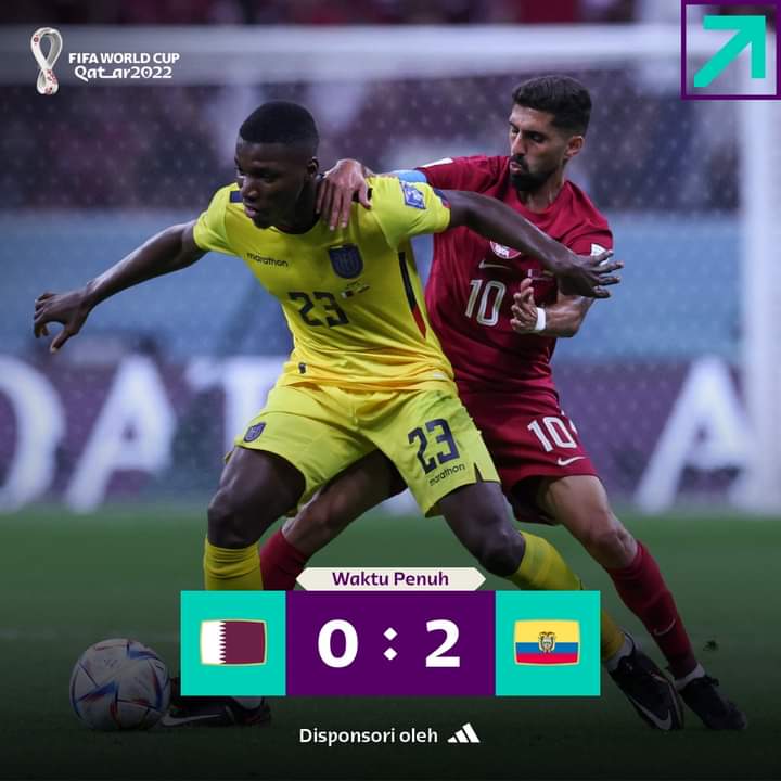 Jakarta – Tuan rumah Qatar gagal menampilkan permainan terbaik mereka dan masih belum mampu mengimbangi Equador yang merupakan wakil dengan urutan lolos terendah dari zona CONMEBOL. Ekuador membekuk tuan rumah Qatar dalam pertandingan pembuka Piala Dunia 2022, Minggu (20/11/2022). Tim tamu mengamankan tiga poin perdana lewat skor 2-0. Bermain di Al Bayt Stadium, Qatar tampak tidak maksimal sejak menit awal. Para pemain Qatar tampak grogi, sering terjadi salah operan dan terlambat menutup ruang kosong di lapangan. Buruknya permainan Qatar ditunjukkan hanya satu peluang yang diciptakan selama pertandingan berlangsung.