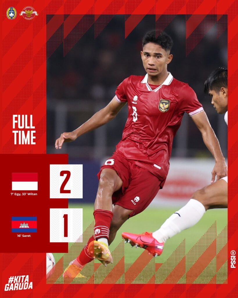 Jakarta – Timnas Indonesia berhasil memetik tiga poin di laga perdana Piala AFF 2022 usai menundukkan Kamboja dengan skor 2-1 di Stadion Gelora Bung Karno, Jakarta, Jumat (23/12). Pasukan Shin Tae-yong unggul cepat lewat sontekan Egy Maulana Vikri di menit ketujuh, memanfaatkan crossing manja Pratama Arhan. Namun Kamboja asuhan Keisuke Honda mampu membalas lewat Sareth Krya lima menit berselang. Untungnya, Witan Sulaeman mampu mengembalikan keunggulan Garuda saat menyelesaikan kerja sama Ricky Kambuaya dan Marselino Ferdinan di menit ke-35.