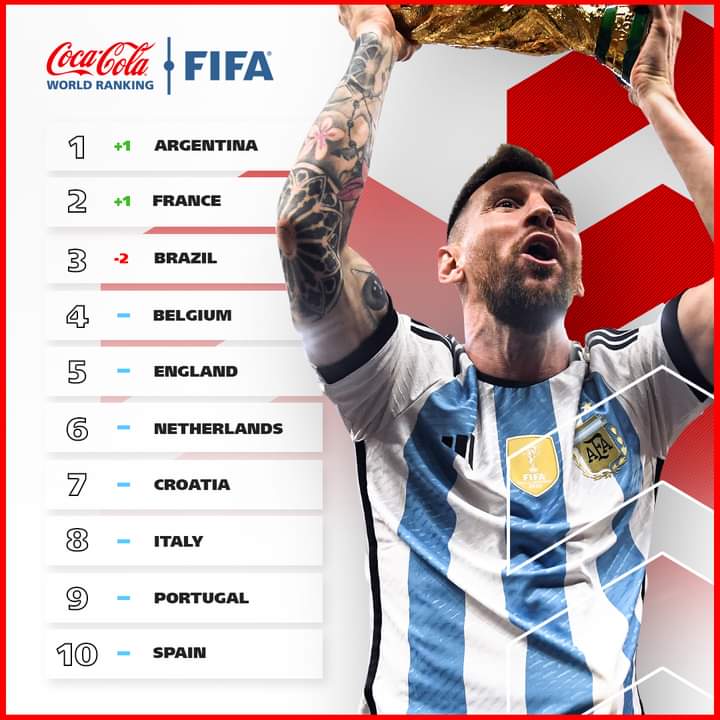 Jakarta – FIFA telah meresmikan daftar rangking terbaru usai Piala Dunia 2022. Sudah bisa diduga bahwa Argentina yang berhasil menjadi Juara Dunia 2022 berada di posisi pertama. Lalu peringkat kedua diduduki oleh Prancis yan juga merupakan Runner up Piala Dunia 2022 usai dikalahkan Argentina di partai final. Keduanya berhasil menggeser posisi Brasil yang sebelumnya berada di posisi pertama sebelum Piala Dunia 2022 dimulai.