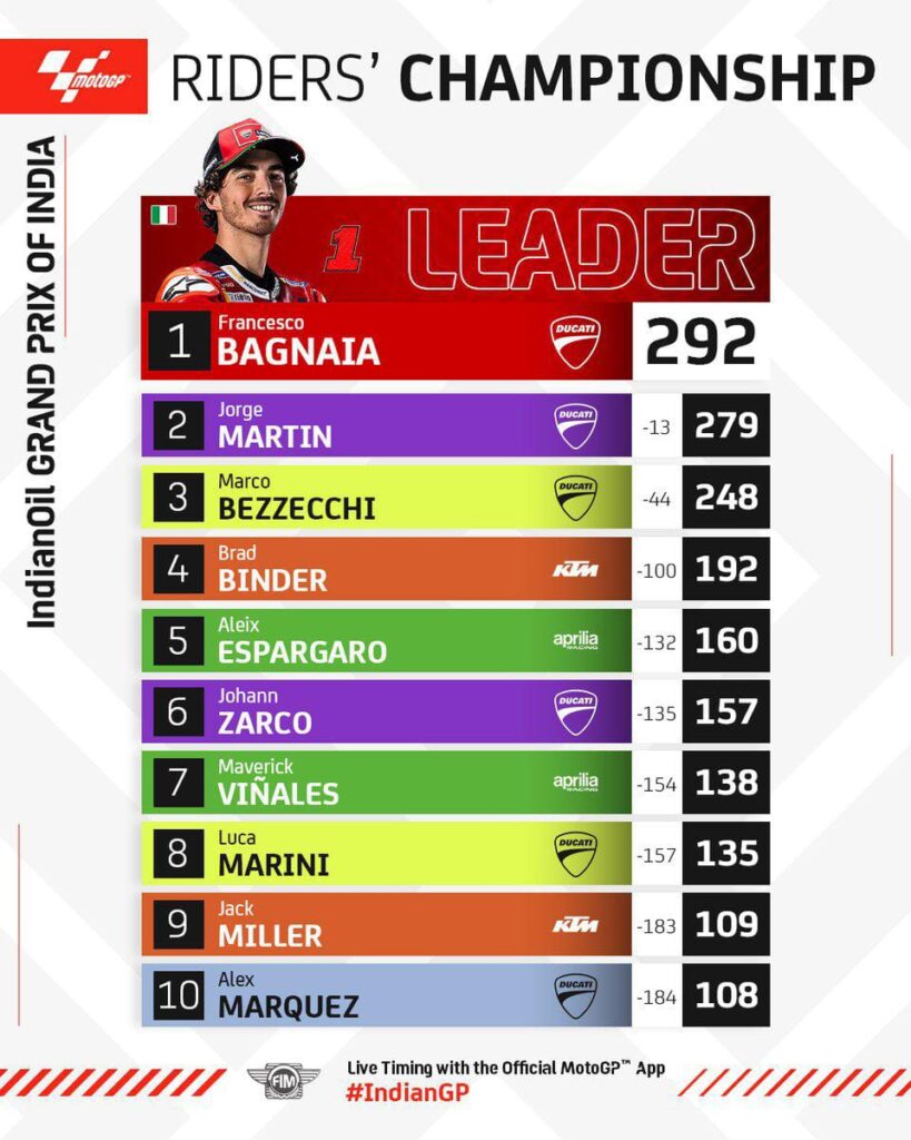 1. Pecco Bagnaia – Ducati Lenovo Team – Ducati: 292