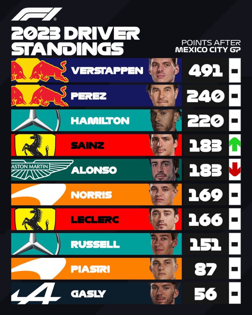 Berikut klasemen sementara Formula 1 2023 usai Seri Meksiko di Autodromo Hermanos.
