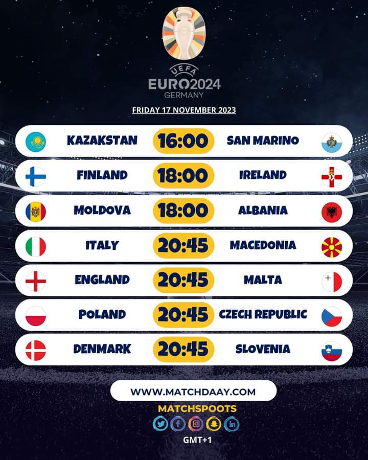 Di laga lainnya, tim dinamit Denmark akan berhadapan dengan kuda hitam Slovenia. Sementara Polandia akan menjamu Republik Ceko. Sedangkan Irlandia akan menghadapi Finlandia dan dua tim lemah akan bertemu yaitu Moldova dan Albania.