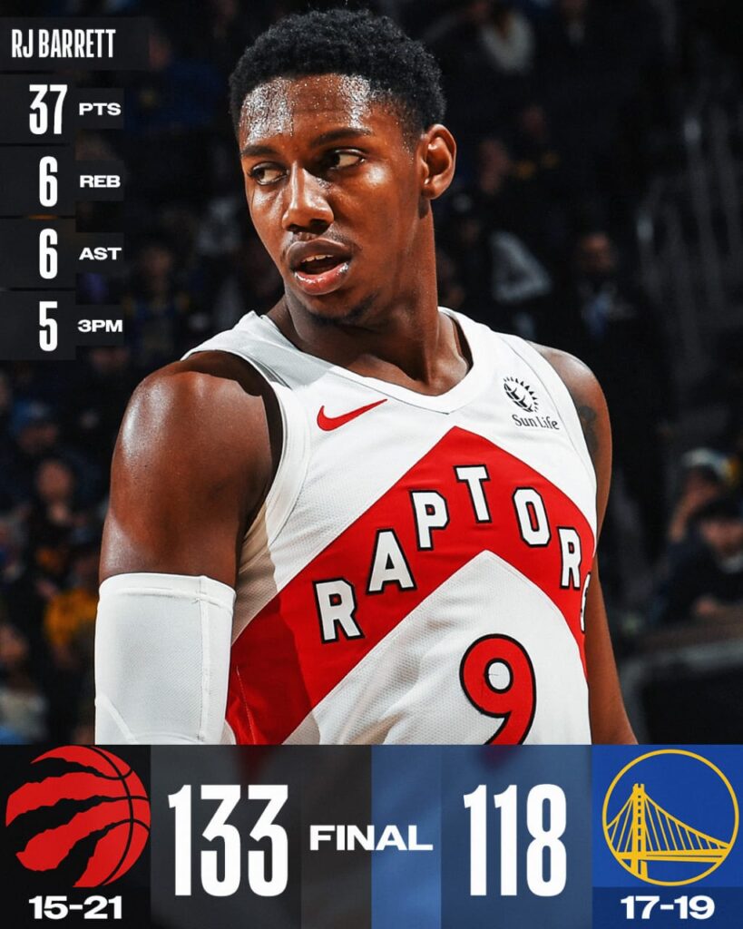 Pada laga lainnya, Golden State Warriors dipermalukan Toronto Raptors di Chase Center dengan skor telak 118-133. Sang legenda hidup, Stephen Curry tak bisa berbuat banyak meski bermain selama 30 menit dengan hanya mengoleksi sembilan poin, enam assist dan satu rebound. RJ Barret tampil sebagai bintang bagi Raptors dengan menghasilkan 37 poin, enam rebound dan enam assist. Jakob Poeltl juga bermain sangat baik dengan membukukan double-double di angka 14 poin, 11 rebound dan lima assist. Kekalahan itu membuat Warriors telah menelan 19 hasil minor musim ini sehingga tercecer di peringkat 11 klasemen sementara wilayah barat dengan rekor 17-19. Sedangkan Raptors berada di posisi yang sama di wilayah timur dengan rekor 15-21.