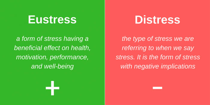 Apakah seseorang mengalami distress atau eustress sangat bergantung pada persepsi mereka terhadap diri mereka sendiri dan stresor. Sebagai contoh, individu akan lebih mungkin mengalami eustress jika mereka percaya bahwa mereka dapat menyelesaikan masalah. Penilaian positif terhadap stresor ini membantu mereka menyalurkan energi yang disediakan oleh respons fight-or-flight untuk mencari solusi.