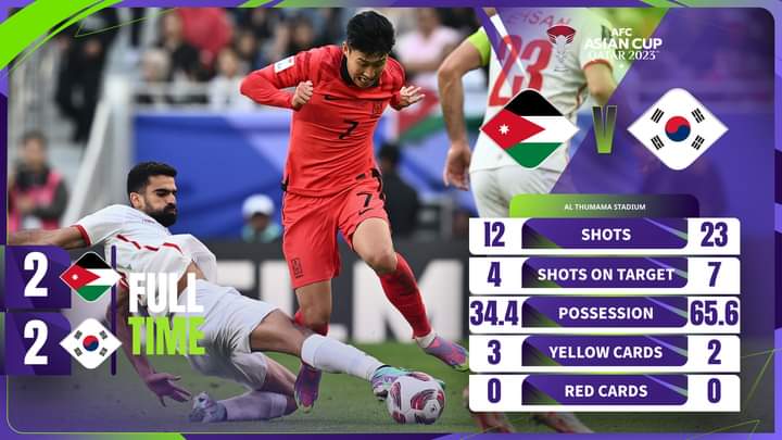 Laga Grup E antara Yordania vs Korsel berlangsung di Stadion Al Thumama, Doha, pada Sabtu (20//2024) malam WIB. Dengan satu tambahan poin ini Yordania masih di peringkat teratas klasemen grup setelah mengumpulkan empat poin. Korsel di peringkat kedua dengan perolehan angka yang sama.