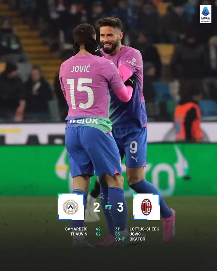 Jakarta – Rossoneri sukses mewujudkan kemenangan 3-2 saat melawan tuan rumah Udinese di depan suporter mereka. Hasil ini tak mengubah posisi Milan di urutan ketiga klasemen dengan koleksi 45 poin dari 21 pertandingan. Mereka berjarak empat angka dari runner-up Juventus dan pemuncak klasemen Inter, yang sam-sama menyimpan satu laga lebih banyak.
