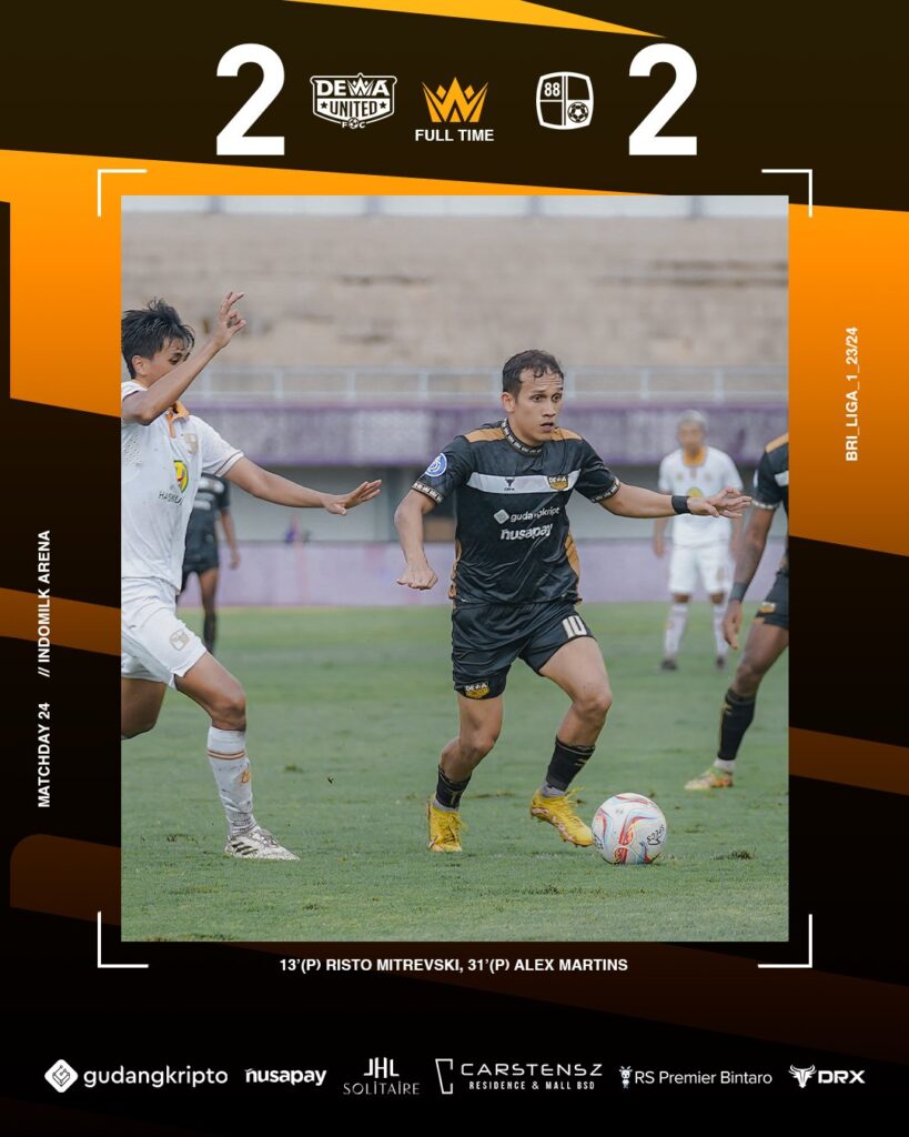 Jakarta – Duel Dewa United vs Barito Putera digelar dalam rangkaian lanjutan pekan ke-24 Liga 1 Indonesia, dilaksanakan di Indomilk Arena, Tangerang, Banten pada Selasa (6/2/2024) sore WIB. Laga seru tersebut berakhir imbang dengan skor 2-2. Gol Dewa United tercipta lewat tendangan penalti Risto Mitrevski (13’) dan Alex Martins (31’). Sementara itu, Barito Putera membalas dua gol via Natanael Siringoringo (19’) dan Gustavo Tocantins (61’).
