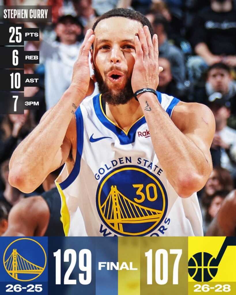 Sementara dalam laga lainnya, Golden State Warriors berhasil mengandaskan perlawanan Utah Jazz pada lanjutan NBA, dengan skor 107-129. Hasil itu pun membuat Stephen Curry dkk pun sukses mengemas lima kemenangan secara beruntun. Tercatat, Warriors mampu menang poin di kuarter pertama dengan 26-34, 25-30 di kuarter tiga dan 27-36 di kuarter empat. Ada pun kedudukan poin imbang 29-29 di kuarter kedua. Sehingga skor akhir 107-129.