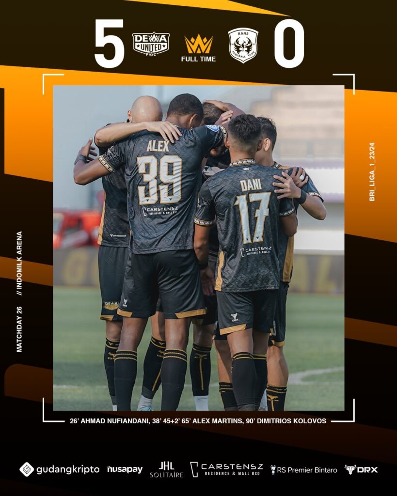 Jakarta – Dewa United pesta gol ke gawang RANS Nusantara dan memperpanjang catatan tanpa kekalahan menjadi enam laga di Stadion Indomilk Arena. Dewa United sukses meraih kemenangan telak 5-0. Kemenangan itu mengangkat posisi Dewa United ke peringkat ketujuh klasemen selepas mengoleksi 35 poin. Sedangkan RANS tertahan di posisi kesepuluh dengan nilai 33.